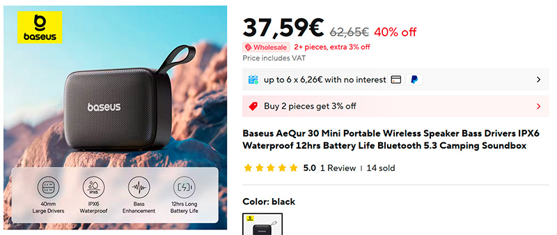 Компактная беспроводная колонка Baseus (ссылка для РФ). Размер 80х112 мм, 40 мм драйвер, IPX6 влаго- и пыленепроницаемый корпус, Bluetooth 5.3, два режима воспроизведения: вокал и супер бас. Автономность - 12 часов.