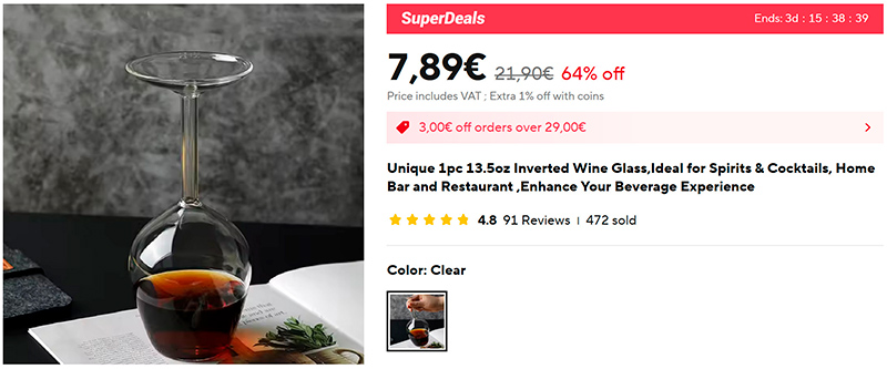 Я люблю такие приколы - инвертированный бокал для вина (ссылка для РФ). Для розыгрышей, для развлечения, для любителей фильма "Довод" Нолана. Понятно, что там пить надо из подставки - посмотрим, насколько это удобно. Но для прикола - сойдет в любом случае.
