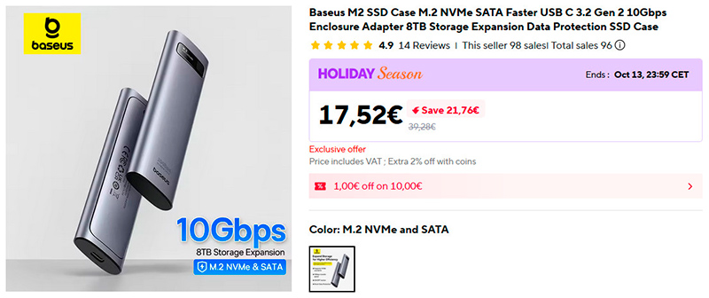 Подключается по Type-C, но в комплекте есть переходник под USB-A, поддерживает все типоразмеры M.2 от 2230 до 2280, у него есть кнопка включения/выключения, чтобы не тратить электроэнергию, когда диск не используется.