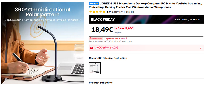 Десктопный микрофон UGREEN, подключаемый по USB. Активный шумодав 60 дБ, регулировка громкости, гибкая стойка. Микрофон такого рода дает заметно лучшее качество голоса, чем встроенный микрофон веб-камеры.
