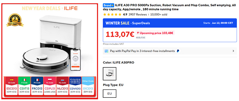 Я недавно делал обзор пылесоса TP-Link Tapo RV30 MAX Plus, который при стоимости в €189 имеет лидар и отдельный мусоросборник, и вот теперь на Aliexpress можно купить очень популярную модель робота-пылесоса ILIFE A30 PRO, который стоит €113, при этом также имеет лидар и отдельный мусоросборник. Управляется через приложение, строит карты помещений, имеет мощность всасывания 5000 Па, есть функция влажной уборки, может убирать конкретные зоны, есть режим максимальной мощности для уборки ковров. От одной зарядки работает до 180 минут, при этом убирает 120 кв.м. помещений. Понимает голосовое управление, самостоятельно отправляется на базу для зарядки. Более 10 тысяч продаж со средним рейтингом 4,9.