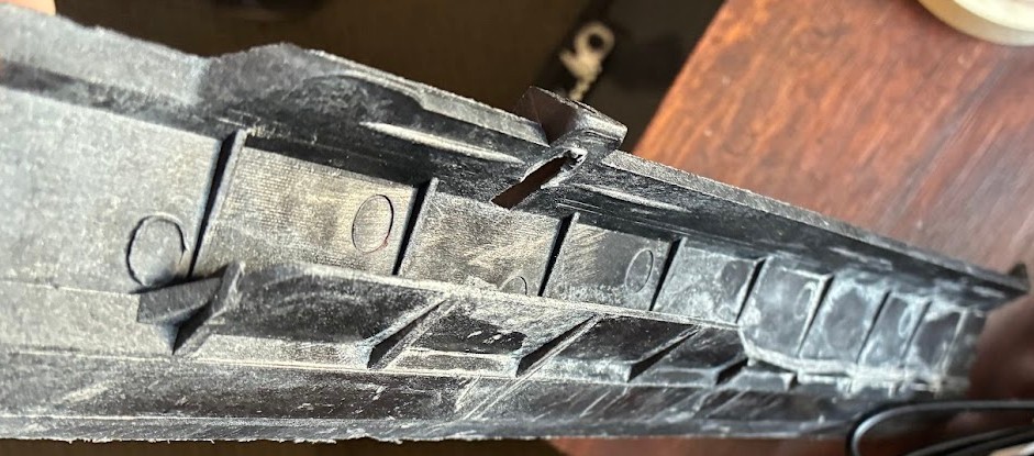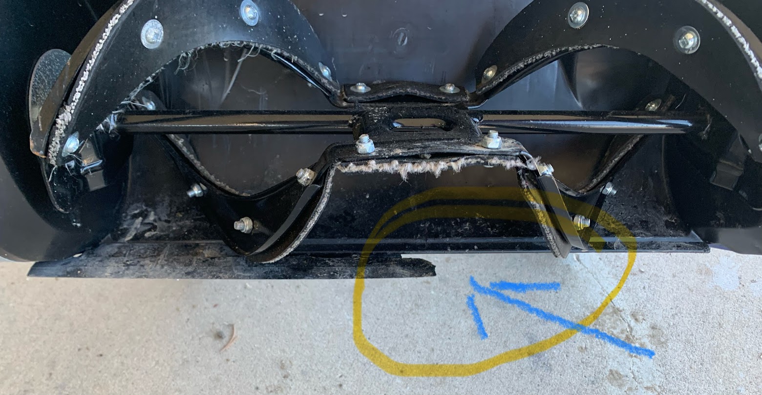 Что мы и наблюдаем на фотках - сломалось вот этот latch (извините не знаю как на русском) который прикрывает снизу. Запасные фирма не производит и поддержка на емыл не отвечает (телефон поддержки у них вообще убрали с сайта). Если latch убрать целиком, 60% снега оно выталкивает сзади на ботинки.