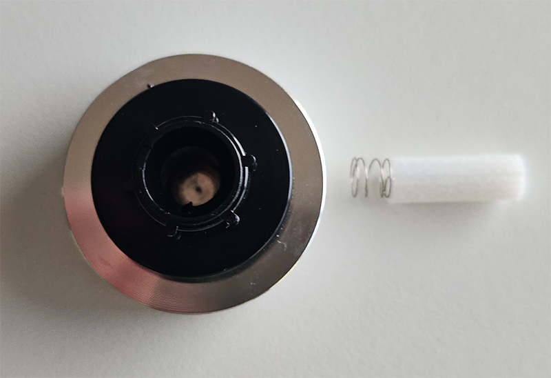 Контейнер просто вытаскивается, в него из баночки заливается половина пипетки масла (пипетка там в крышке), после чего вставляется белый столбик на пружинке, контейнер вставляется в устройство, нижняя крышка закрывается.
