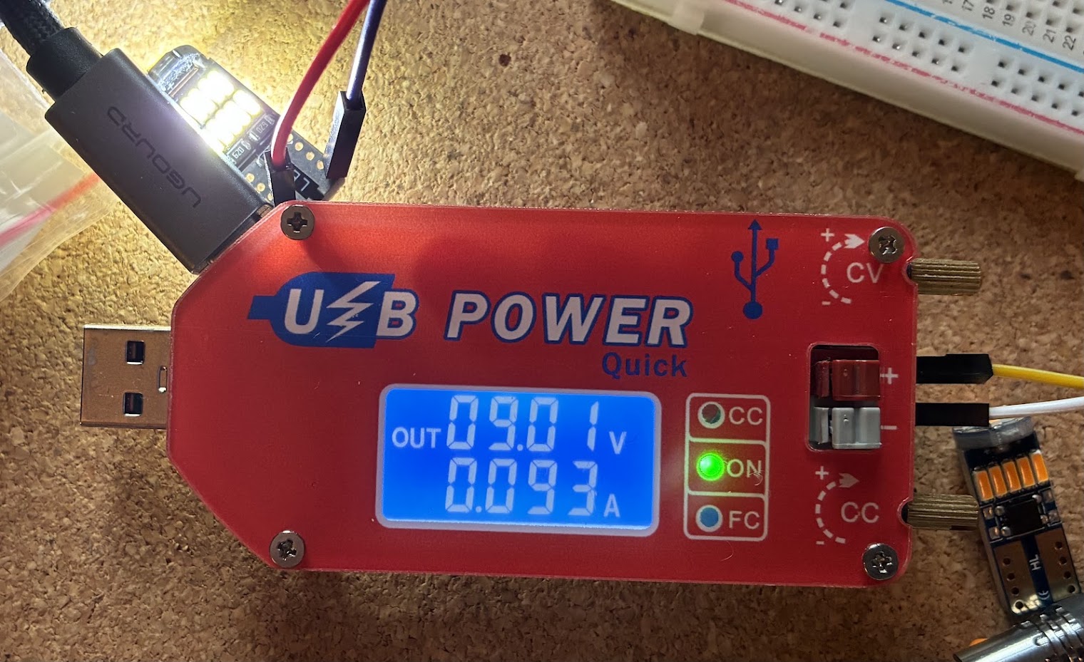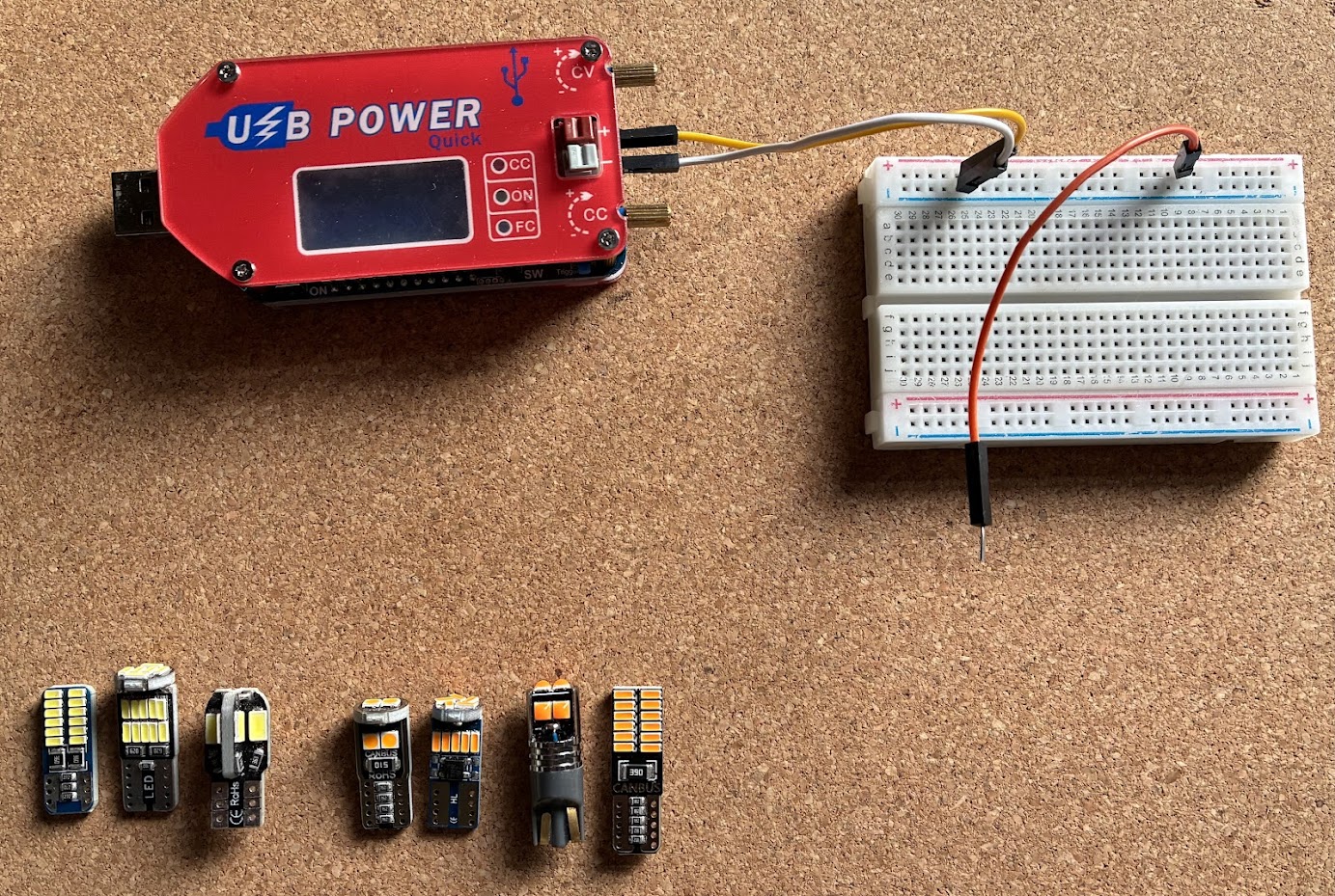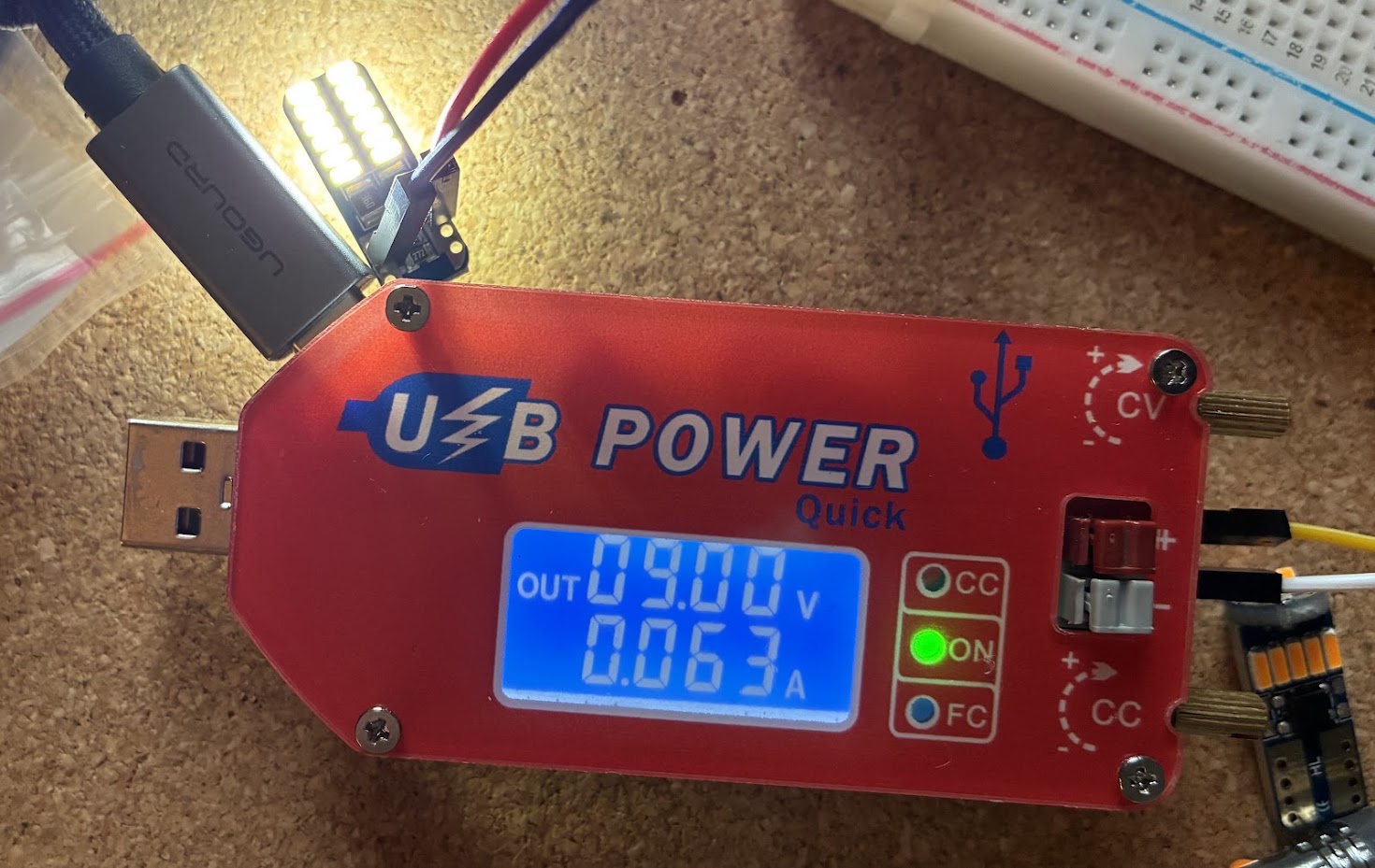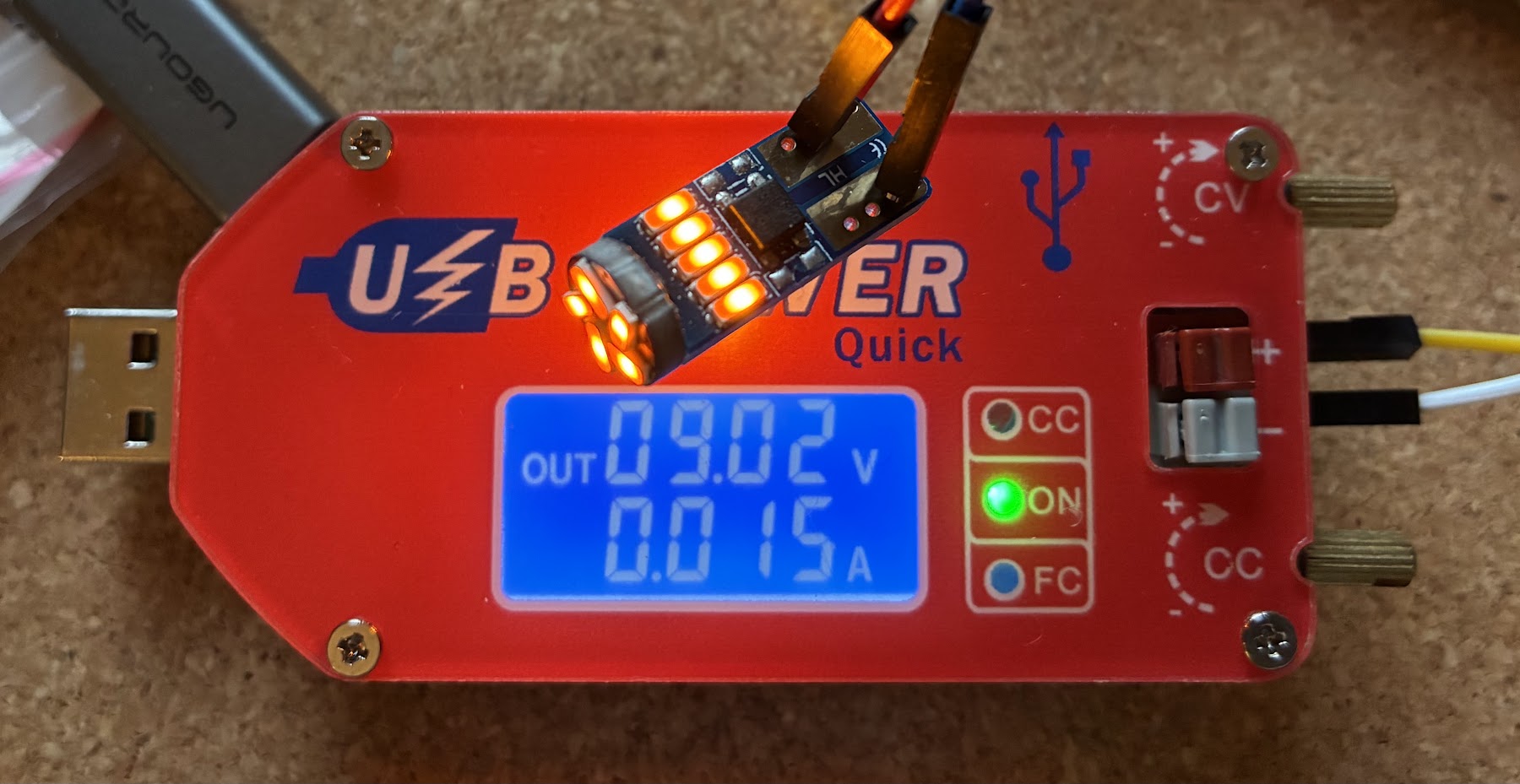 DC-DC converter через USB-C с возможностью плавно изменить напряжение.Удалось установить что T10 лампы без проблем работают на 9в без особого снижения яркости и не греются.Несколько результатов проверки