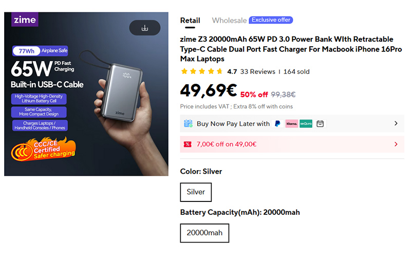 Компактный внешний аккумулятор Zime Z3 на 20000 мАч мощностью 65 Вт (на вход и выход). Имеет встроенный кабель Type-C, поддерживает PD 3.0, подходит для зарядки ноутбуков. У него есть еще порты Type-C и USB-A, а также дисплей, на котором показывается уровень заряда. Такой аккумулятор разрешается брать с собой в кабину самолета.