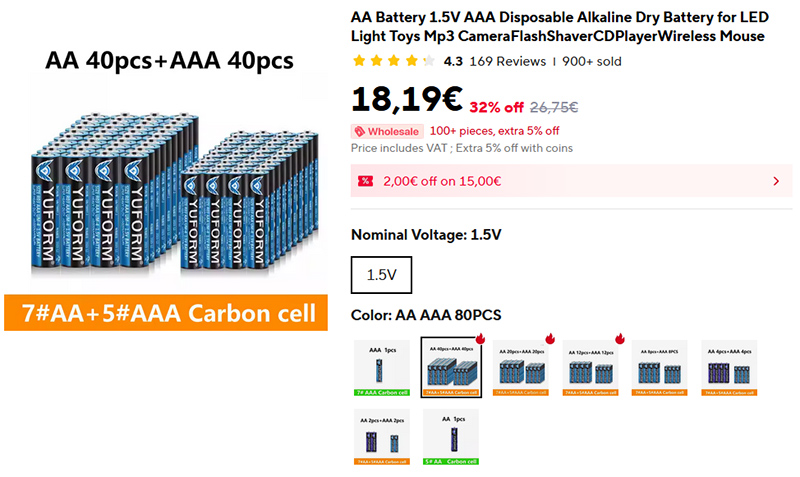 Всегда нужные в хозяйстве щелочные батарейки AA и AAA. Например, комплект из 20 AA и 20 AAA батареек обойдется всего в 11 евро, а комплект из 40 тех и других (всего 80 штук) обойдется в 18 евро.