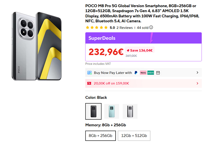 Хорошая цена на новый смартфон POCO M8 Pro 5G - в испанском Amazon цены на них - от 280 евро. Дисплей AMOLED с яркостью аж 3200 нит, влагозащита, достаточно мощная платформа Qualcomm Snapdragon 7s Gen 4 (4 nm), камера 50 MP 1/1.55" PDAF OIS и сверхширик, кремний-углеродный аккумулятор емкостью аж 6500 мАч с мощностью зарядки 100 Вт. За такие деньги - отличный вариант.