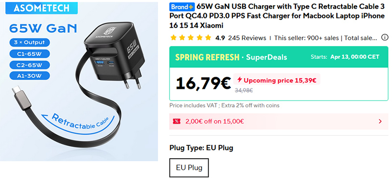 Недорогой GaN-адаптер Asometech на 65 Вт для быстрой зарядки до трех устройств. Выдвижной кабель и два порта Type-C. Поддерживает протоколы QC4.0 PD3.0 PPS, подходит для ноутбуков.