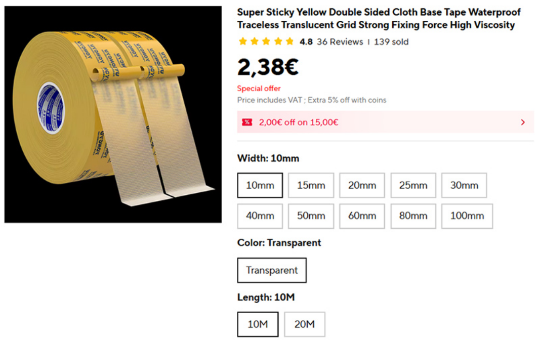 Хороший выбор двухсторонней прозрачной клейкой ленты для самых разнообразных применений. Ширина от 10 до 100 мм, длина 10 и 20 метров.