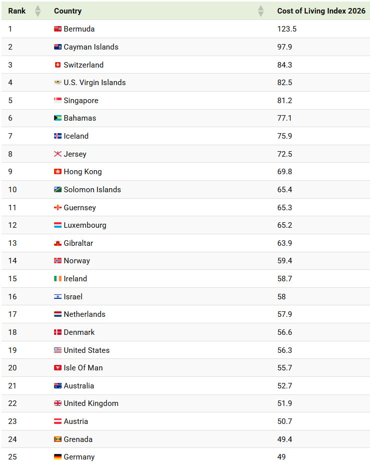Бермудские острова — самое дорогое место для жизни в мире в 2026 году, с ценами на 23,5 % выше, чем в Нью-Йорке.