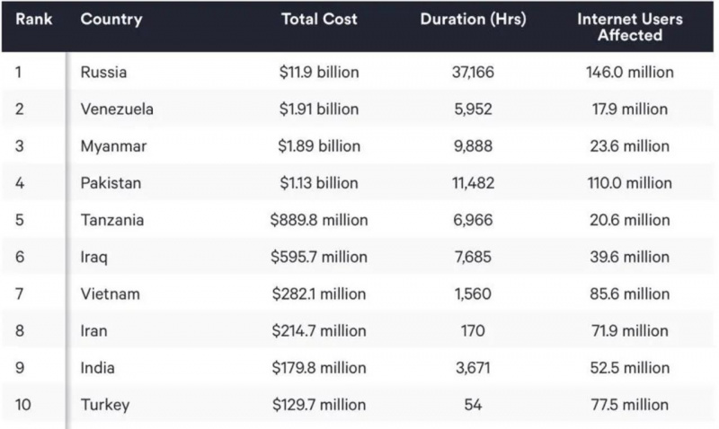 Такие отключения не только приносят неудобства гражданам, но и наносят реальный ущерб экономике. Объем сопутствующего ущерба эксперты оценили в $11,9 млрд (около 930 млрд рублей) - это больше, чем у всех остальных стран рейтинга вместе взятых ($7,8 млрд).