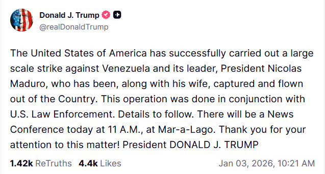 Пост Трампа. Утверждает, что они захватили Мадуро с женой и уже их вывезли из страны. Интересно, куда.