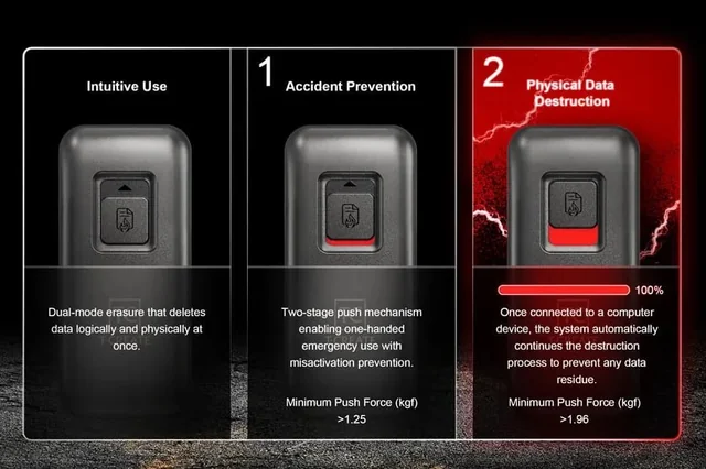 Переключатель, разумеется, защищен от ложных срабатываний: он достаточно тугой, а кроме того, для уничтожения его нужно передвинуть на две позиции, а не на одну.