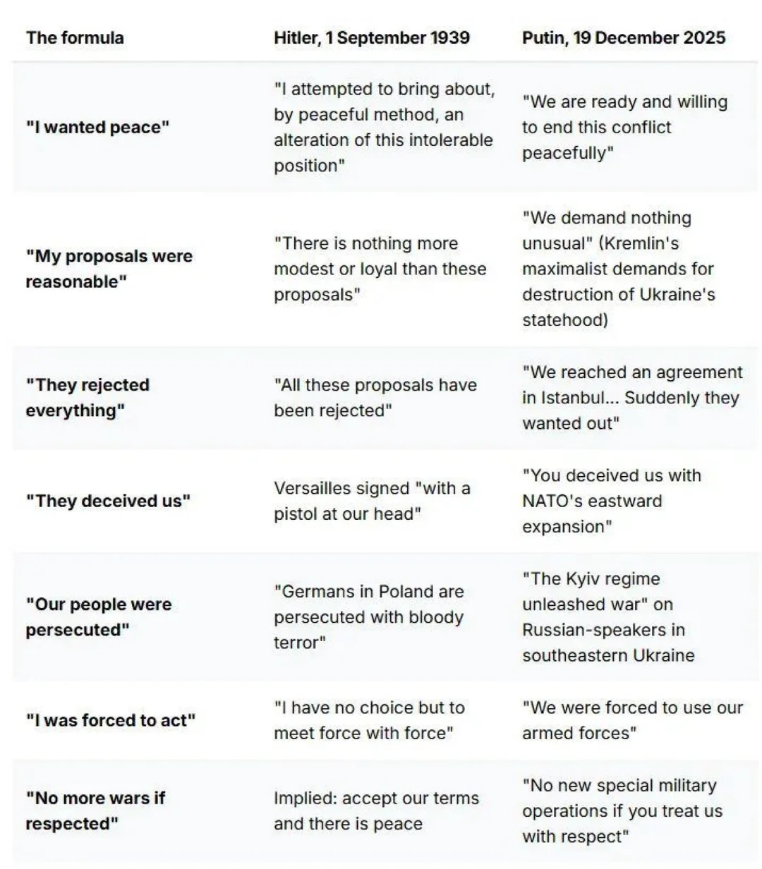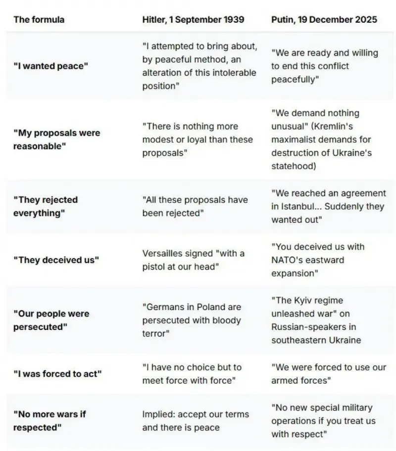 Информационное агентство Euromaidan Press сравнило основные тезисы речи Путина от 19 декабря 2025 года с речью Гитлера в Рейхстаге в 1939 году.