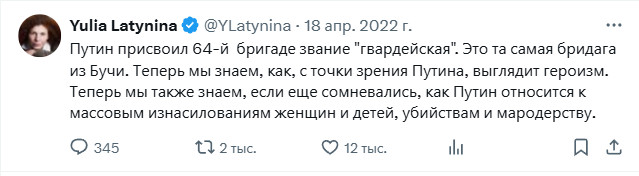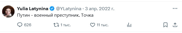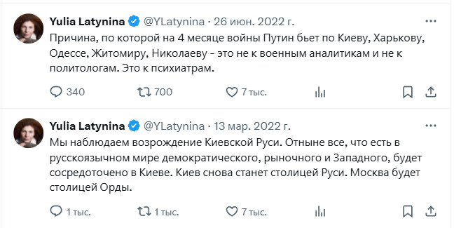 Я тут зашел в ее Твиттер не залогинившись. И обнаружил, что мне движок сверху почему-то показывает ее старые посты весны-лета 2022 года. И, знаете ли, так удивительно это все читается на фоне ее нынешних фееричных заявлений - это что-то!