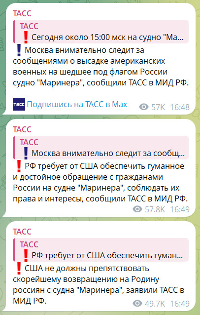 Министерство транспорта России заявило, что потеряло связь с «Маринерой» после того, как на борт поднялись военно-морские силы США. Старший российский законодатель из правящей партии «Единая Россия» Андрей Клишас заявил, что захват США является актом явного пиратства, сообщает государственное информационное агентство ТАСС. (Отсюда.)