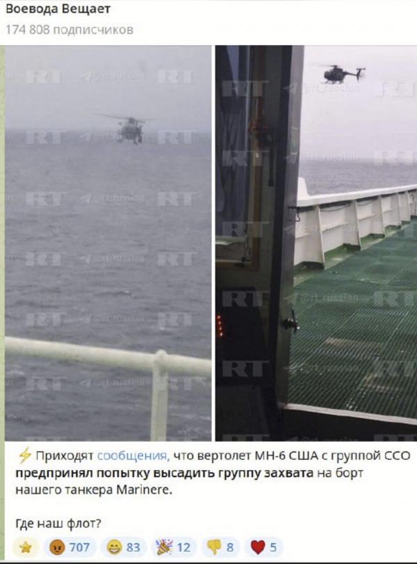Американцы все-таки захватили танкер российского теневого флота, перевозящий венесуэльскую нефть. Преследовали они его не одну неделю. Через некоторое время после начала преследования на танкере нарисовали российский флаг, но американцы продолжали его преследовать. Тогда на верхнюю палубу танкера вывели медведя и сыграли на балалайке - тоже не помогло. Потом из РФ по официальным каналам попросили американцев не преследовать танкер, который везет вовсе не санкционную нефть, а желатиновых мишек. Но и это не помогло. Вчера в РФ заявили, что танкеру на помощь направлены подводные лодки, другие корабли, спецназ танкерных войск и священная хоругва для защиты.