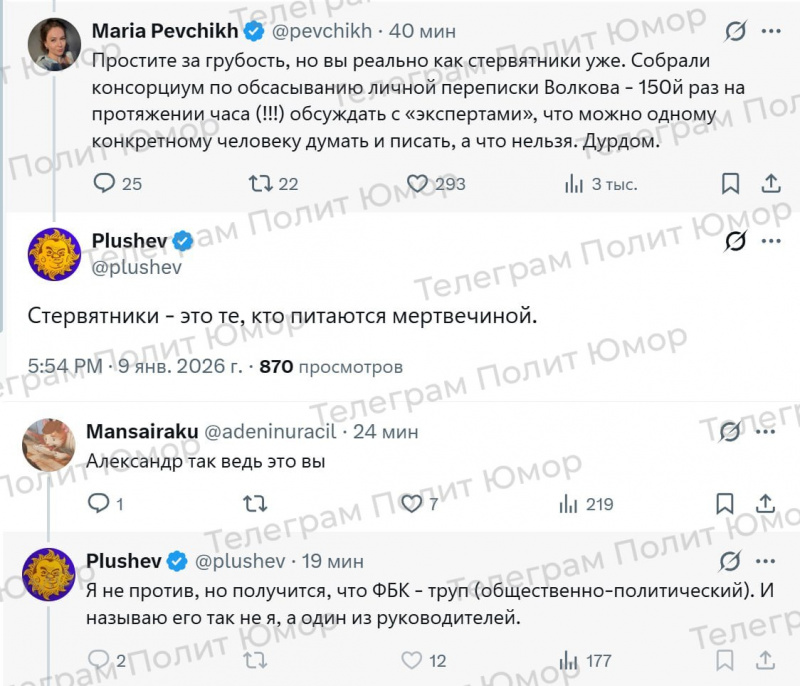 Милов также говорит о том, что "коллеги из ФБК проведут над этим работу", но тут, извините, уже 5 дней прошло с момента публикации Анны Тирон этой переписки, подлинность которой подтвердил сам Волков, а что у нас там по поводу этих потрясающих заявлений их руководителя сказали в ФБК? Ничего не сказали, ноль. Где там эта всегда такая активная Певчих, которая по любому поводу в кожанке и с маузером залезает на броневик? Нет ее, сгинула куда-то, молчит. За все это время только одна какая-то маленькая (в смысле должности) сотрудница ФБК робко написала, что она не понимает, почему руководство молчит по этому поводу - Саша Плющев ее пост цитировал в своем ТГ. И всё!