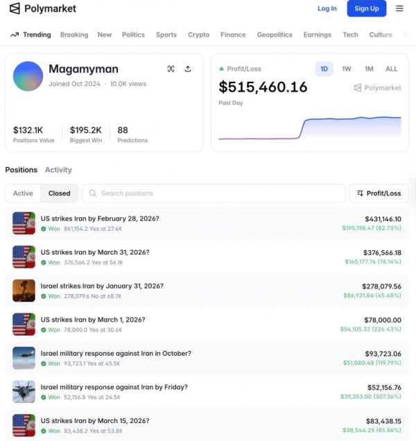 Некий Magamyman, пользователь платформы Polymarket, за один день заработал на прогнозах по ситуации на Ближнем Востоке $515 000. Свою первую ставку он сделал за 71 минуту до того, как новость об ударе по Ирану появилась в СМИ. Причем на момент покупки вероятность успеха оценивалась в 17%.