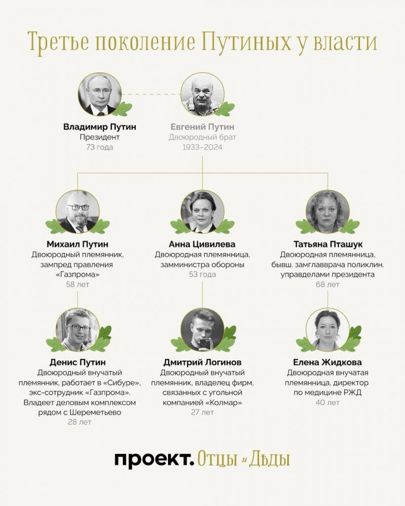 Сразу несколько двоюродных внучатых племянников президента России получили в последние годы должности и доход в связанных с государством структурах. Это родственники, принадлежащие к самой влиятельной ветви путинской родни — линии Евгения Путина, двоюродного брата президента по отцу. Таким образом, уже третье поколение Путиных приходит во власть (сам Путин — первое поколение, его дети и племянники — второе, внучатые племянники — третье). «Проект» установил это во время исследования кумовства в российской власти под названием «Отцы и деды».
