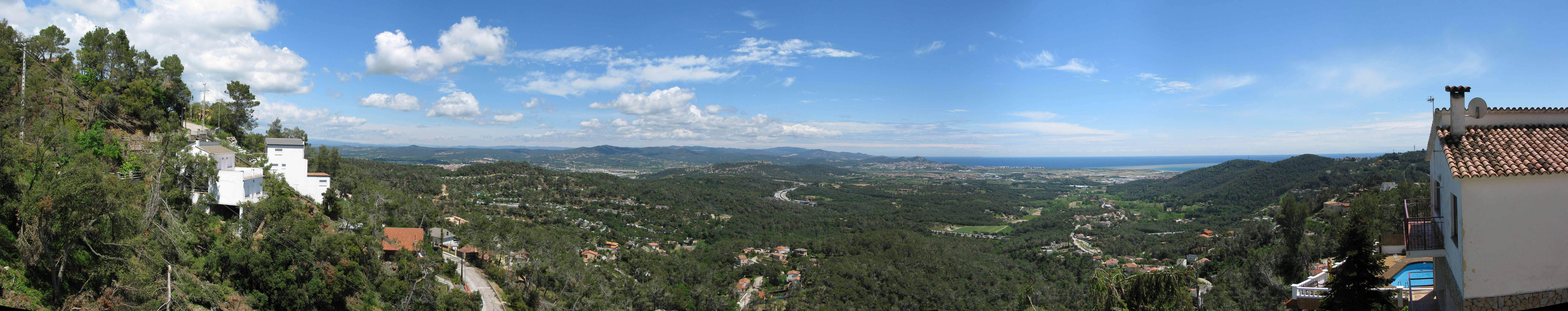 Итак. Вилла на холме на Коста Брава примерно в 60 километрах от Барселоны. До моря (комфортабельный пляж с лежаками, зонтиками и кафе) - порядка 4 километров, 12 минут езды на машине. (Машину можно взять напрокат в соседнем городке, что я и сделал.) Верхний этаж: гостиная, кухня, санузел, балкон. Второй этаж: пять двухместных спален (две больших, три поменьше), холл, санузел. Третий (нижний) этаж - летняя кухня, здоровенная открытая галерея с шикарнейшим видом на долину (вот панорама), балкон, санузел, очаг, мангал. Под ним большая площадка с бассейном (8х4 метра).