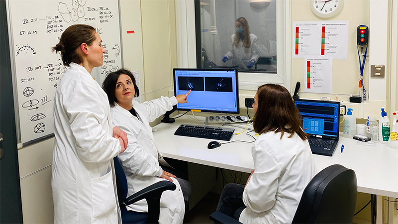 Команда наблюдает за магнитно-резонансными изображениями сердца мыши. Слева направо: Сандра Плаза Гарсия, Ирати Айестаран Зелайя, Ирене Фернандес Фолгуэрал и Марта Бераза. Источник: CIC biomaGUNE