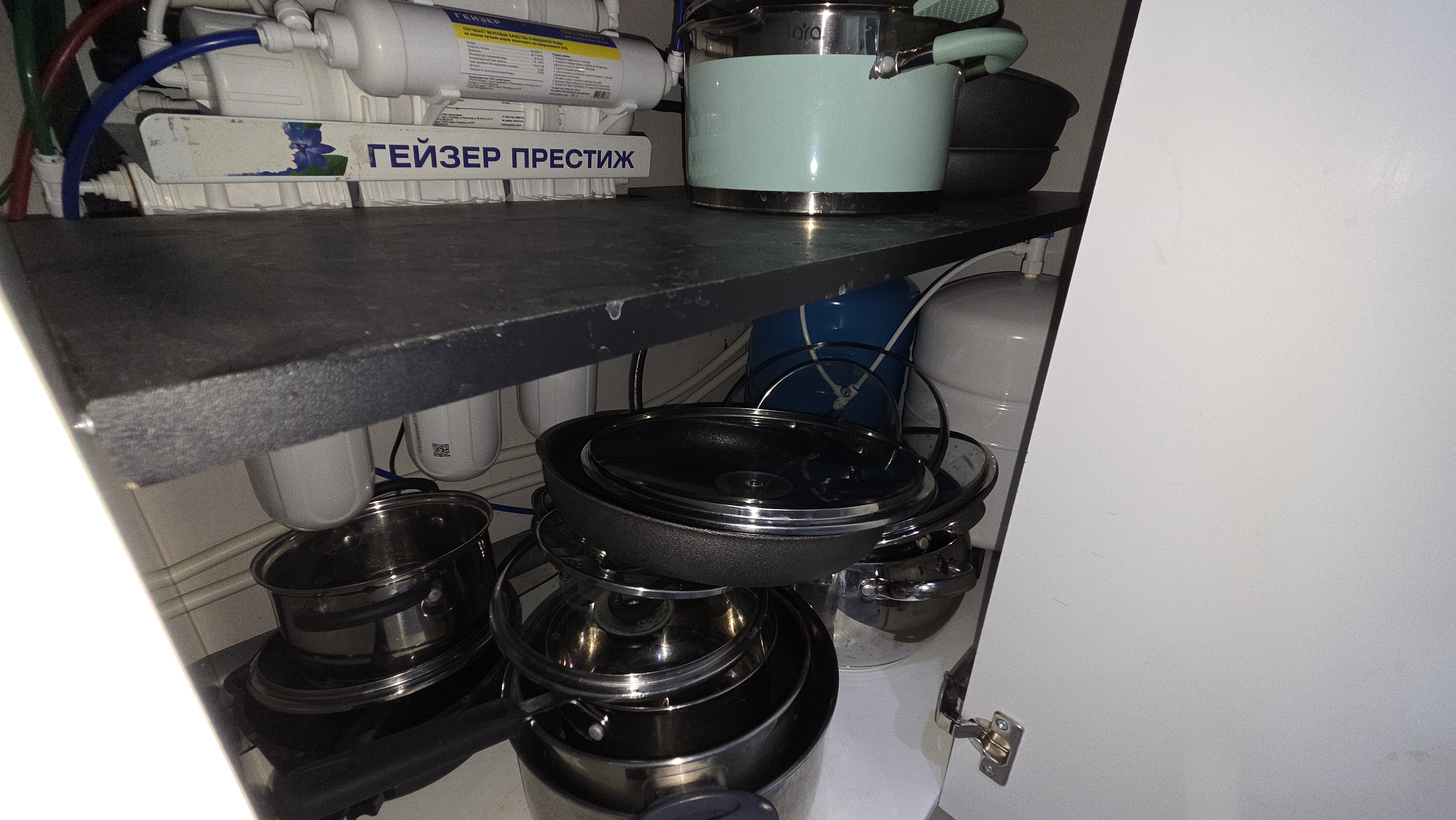 Может, просто в этот дальний угол засунуть то, что нужно раз в году? Например, обратный осмос. Или вторую пачку соды. По-моему, у любой хозяйки на кухне есть такие очень редконужные вещи.