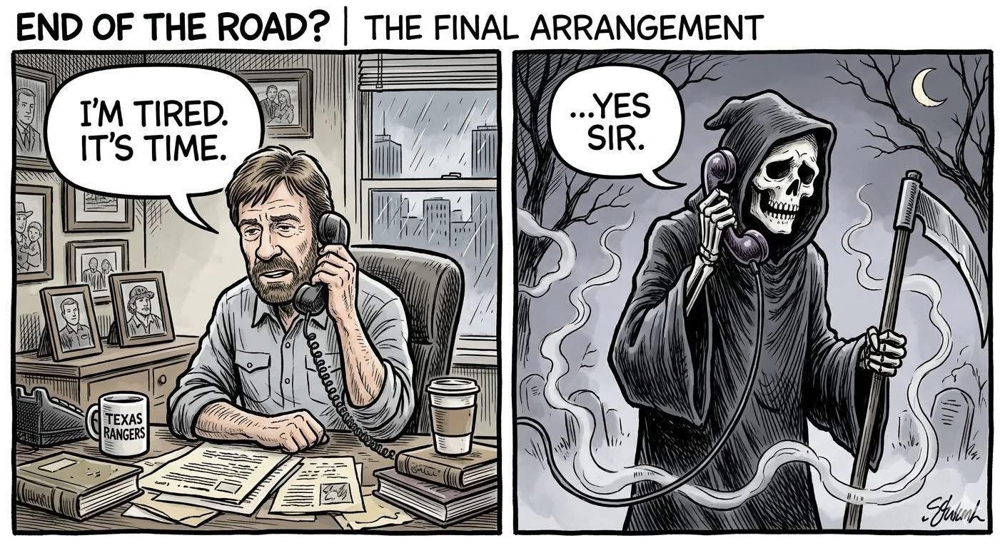 С возрастом я всё реже пересматривал его фильмы, но он всегда был где-то рядом: шутки, мемы, всякие ролики с его драками из фильмов, камео в "Неудержимых". И как-то даже не мог себе представить, что он может умереть. Блин, это же Чак Норрис! Какая нафиг смерть?