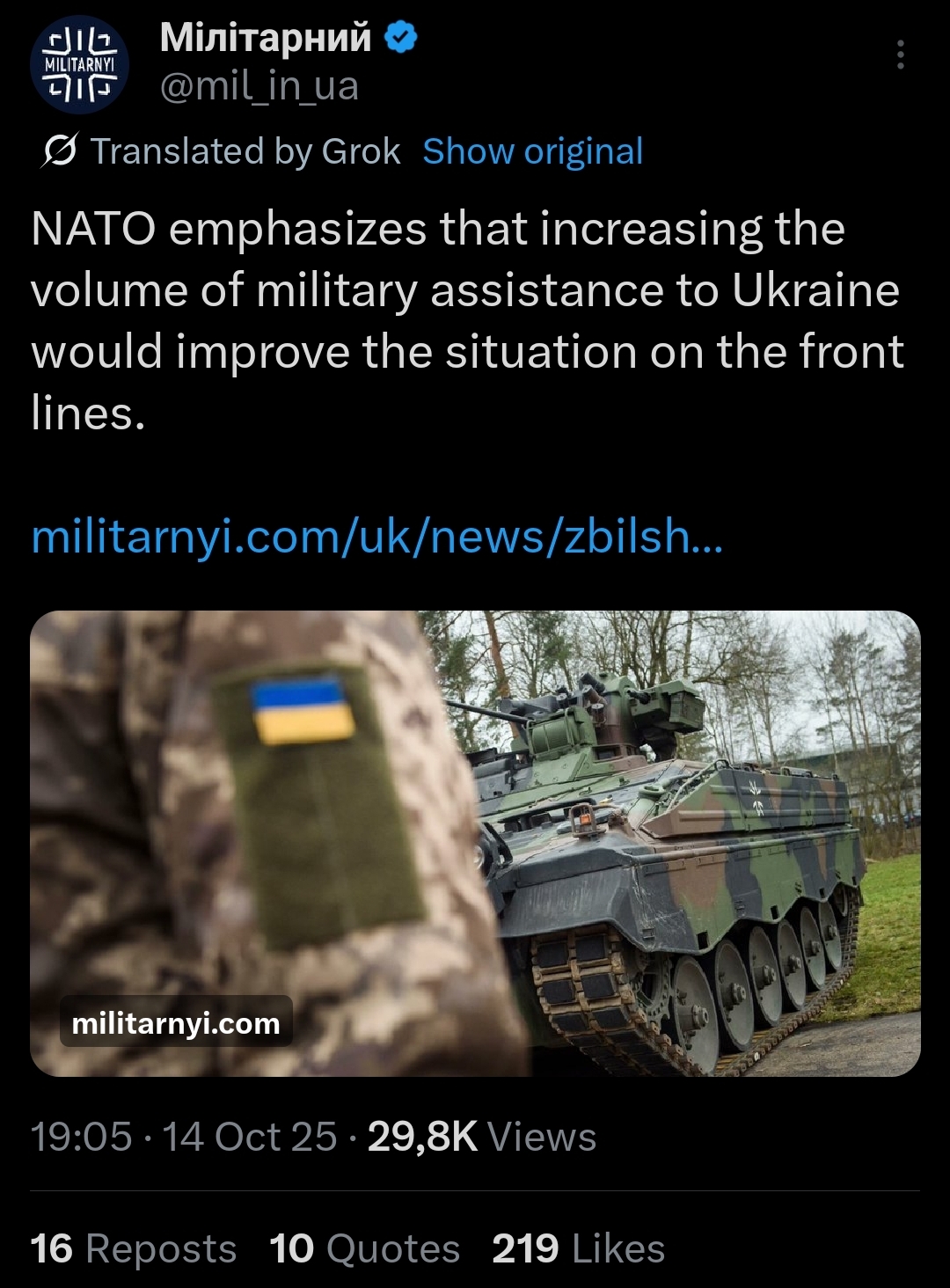 «В НАТО подчеркивают, что увеличение объемов военной помощи Украине позволило улучшить ситуацию на фронте.»