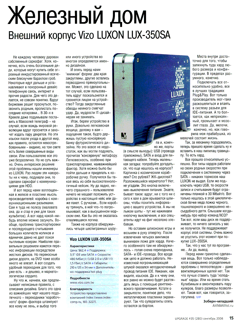 Я теперь с нетерпением жду прихода очередного журнала "Upgrade". Потому что туда пишет Зоберн-младший, а этот парень обязательно порадует очередным шедевром. На этот раз он разразился всесторонним исследованием коробки для внешнего винта. Ну, знаете, такое почти элементарное устройство: пластмассовая коробка с питанием, куда вставляется любой IDE- или SATA-винчестер, и вся эта музыка подключается к компу через USB. Коробки эти все почти одинаковые и отличаются разве что раскраской. Что о них писать? Да вообще нечего.