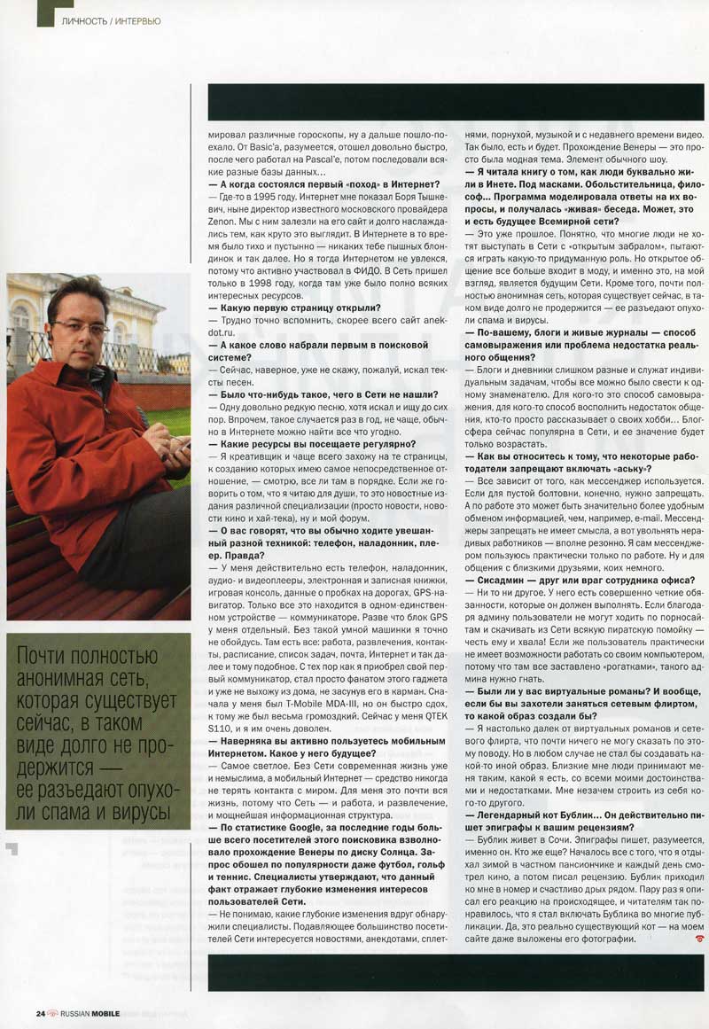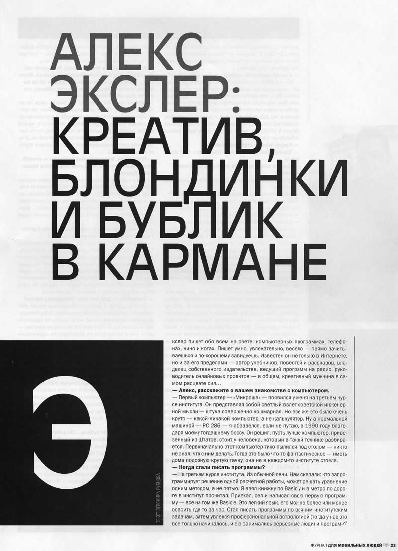 В ноябрьском номере журнала Russian Mobile - интервью со мной под названием "Алекс Экслер: креатив, блондинки и бублик в кармане". Если кому интересно почитать, вот скан: первая, вторая, третья страницы.
