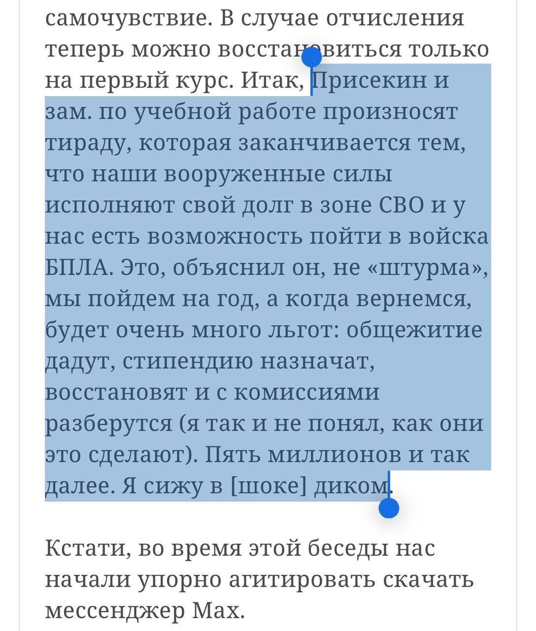 В Мордоре официально ввели квоту на убийства студентов - 2% от каждого вуза. Погибнут не все, где-то 25-30%, также еще где-то процентов 30-40 получат увечья различной степени тяжести. При этом студентам нагло врут, что они будут служить в войсках беспилотных систем, а на деле, конечно, большинство из них будут отправлять в мясные штурмы.