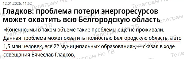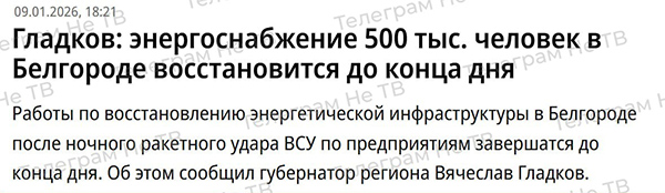 Губер Белгородской области Гладков (это который жителям области предложил не ждать вообще ничего от государства) 9 января заявил, что электричество еще до конца дня починят. (Отсюда.)