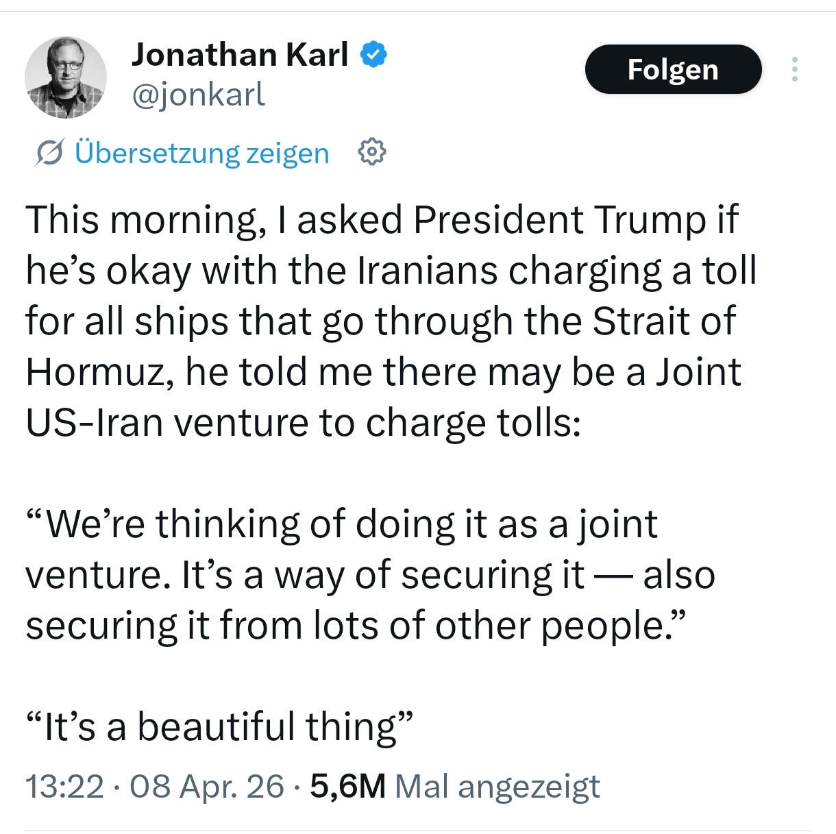 Я только не понял, когда США начнут взимать деньги за проход через Ормузский пролив? Трамп же планировал это делать.