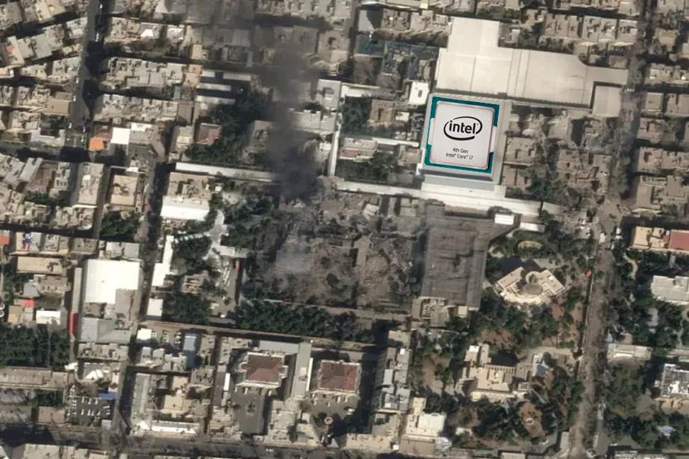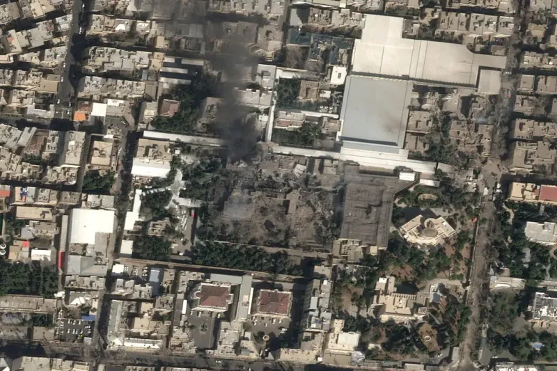 Черный дым, поднимающийся над комплексом аятоллы Али Хаменеи, и серьезные повреждения, нанесенные в результате ударов США и Израиля по Ирану в субботу. Источник: Airbus, через Reuters.