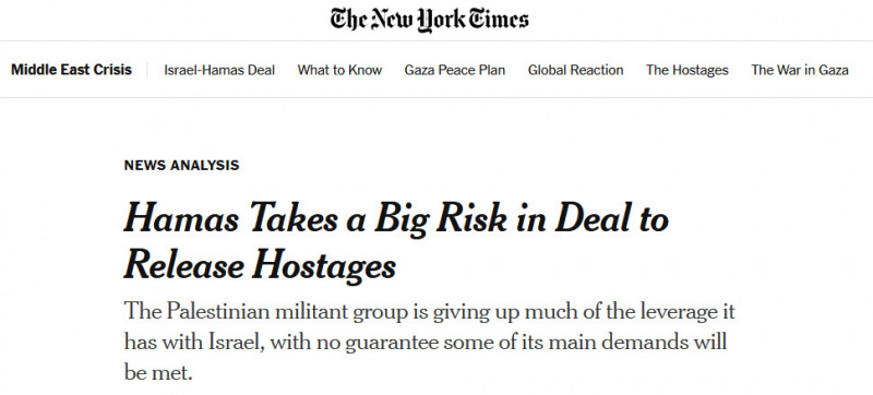 В издании The New York Times страшно переживают, что ХАМАС решил вернуть всех заложников. Рискуют они, говорят в издании. Видимо, им надо было себе хотя бы десяток оставить, чтобы было чем дальше торговаться. А так - сплошные риски.