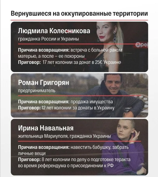 Видел я однажды женщину которая периодически возвращается на оккупированную территорию по каким-то делам связанным с недвижимостью, подробности не узнавал, не настолько близко знакомы. Вроде без ваты в мозгах, но однако же. Был очень удивлен.