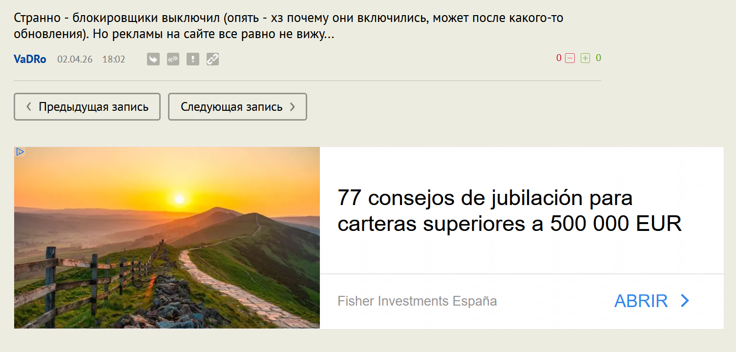 Странно - блокировщики выключил (опять - хз почему они включились, может после какого-то обновления). Но рекламы на сайте все равно не вижу...