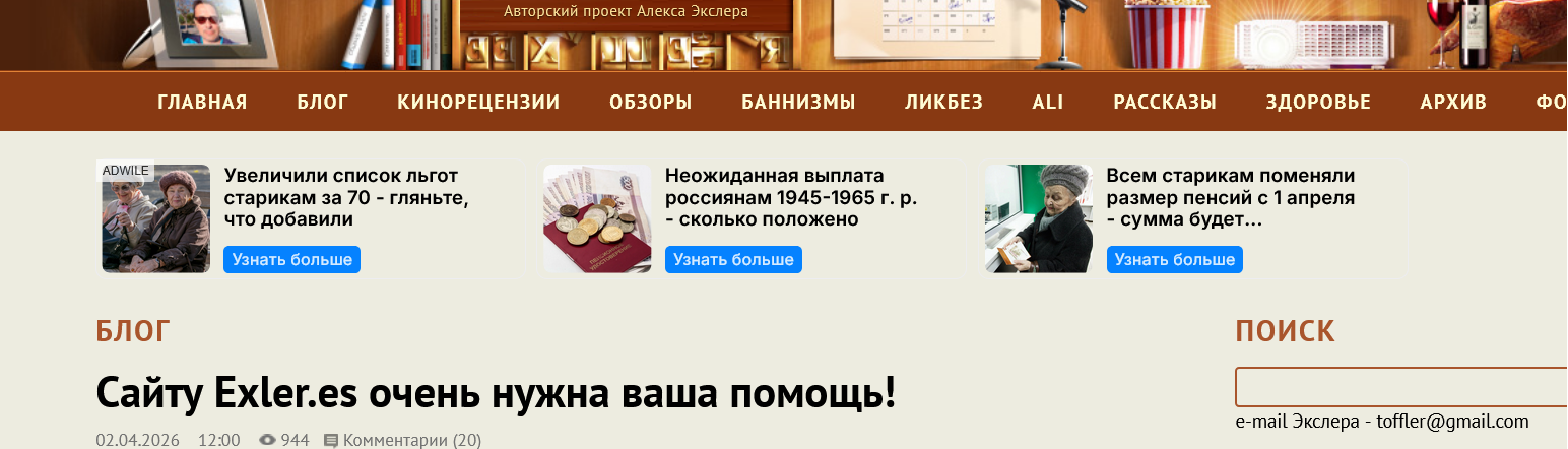 Вы знаете, что сайт Exler.ru заблокирован в РФ (также там блокируют IP-адреса многих западных хостеров, и моего, в том числе), из-за чего он на данный момент потерял две трети ежедневных посетителей и полностью лишился рекламной поддержки из РФ.