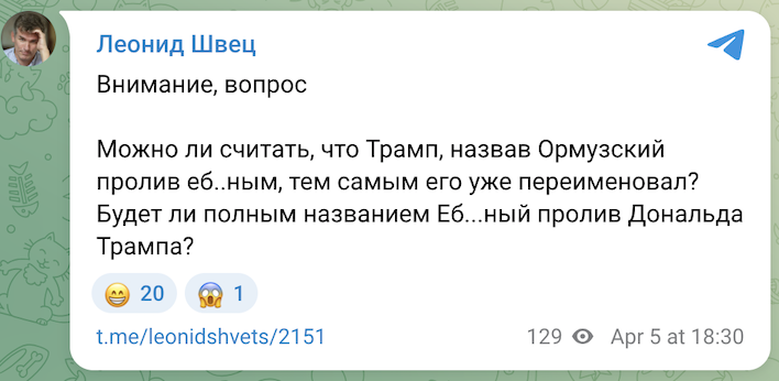 • 27 марта: «Я и аятолла будем вместе управлять Ормузским проливом.»