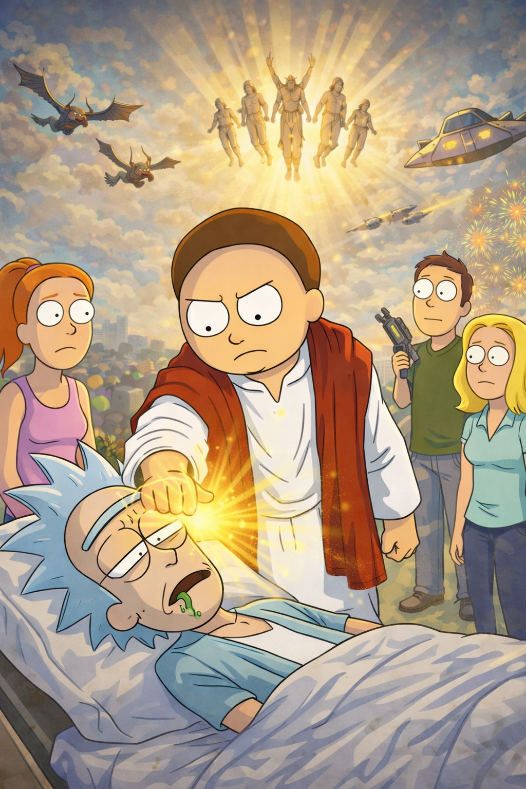 Мое предположение: на картинке - текущий лидер Ирана - Моджтаба Хаменеи. Основания: во первых, он, как говорят, как раз сейчас находится без сознания, так что наверняка лежит на какой-нибудь кровати, окруженный медсестрами. Кроме того, у него есть борода. Так что тут все сходится. Картина изображает, как Трамп посылает Хаменеи мысленные сигналы, чтобы тот наконец очнулся, потому что нужен же кто-то, чтобы с этим кем-то договариваться! Вверху нарисовано сообщение, которое Трамп транслирует в голову Хаменеи - мол, если завтра не очнешься, я пошлю своих морпехов и даже одного назгула (это, вероятно, то самое секретное оружие Трампа, о котором он говорил). Окружающие, по видимому американские граждане, с мольбой смотрят на Трампа, мысленно желая ему удачи. Почему они это делают? Потому, очевидно, что они всегда всей душой поддерживают своего великого президента.