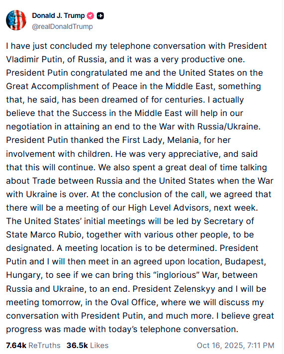 Я только что завершил телефонный разговор с президентом России Владимиром Путиным, и он был очень продуктивным. Президент Путин поздравил меня и Соединенные Штаты с великим достижением мира на Ближнем Востоке, о котором, по его словам, мечтали на протяжении веков. Я действительно верю, что успех на Ближнем Востоке поможет нам в переговорах по прекращению войны между Россией и Украиной. Президент Путин поблагодарил первую леди Меланию за ее работу с детьми. Он выразил ей большую признательность и сказал, что эта работа будет продолжена. Мы также уделили много времени обсуждению торговли между Россией и Соединенными Штатами после окончания войны с Украиной. В заключение разговора мы договорились, что на следующей неделе состоится встреча наших высокопоставленных советников. Первые встречи со стороны Соединенных Штатов будут проводиться под руководством государственного секретаря Марко Рубио вместе с другими лицами, которые будут назначены позднее. Место встречи еще не определено. Затем президент Путин и я встретимся в согласованном месте, Будапеште, Венгрия, чтобы посмотреть, сможем ли мы положить конец этой «бесславной» войне между Россией и Украиной. Президент Зеленский и я встретимся завтра в Овальном кабинете, где обсудим мой разговор с президентом Путиным и многое другое. Я считаю, что сегодняшний телефонный разговор принес большой прогресс.