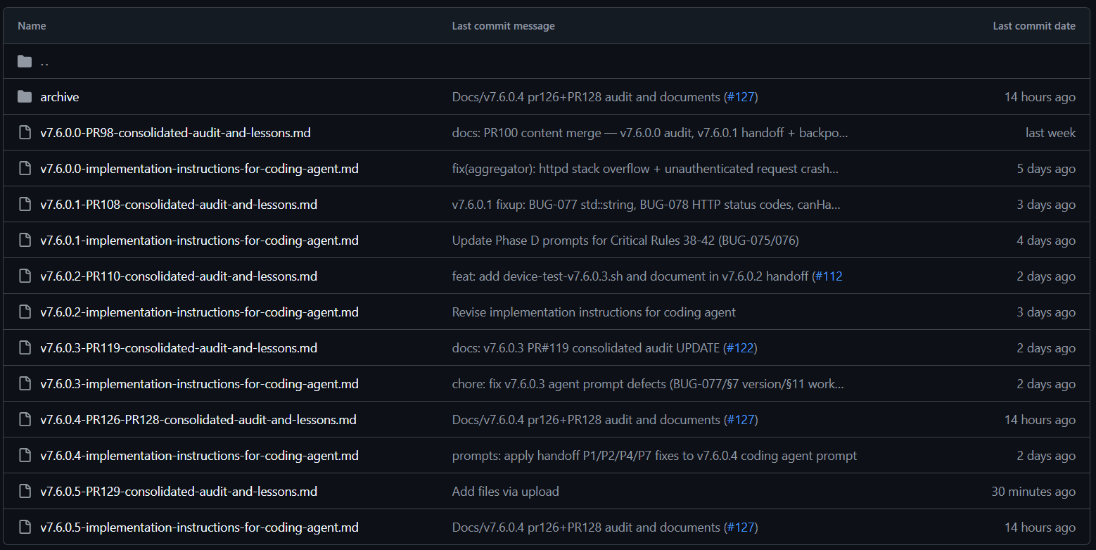 - после этого пишется Consolidated Prompt and PR Audit (для каждого PR), session handoff и добавляется в документацию, как и Changelog, bugs-and-lessons-learned