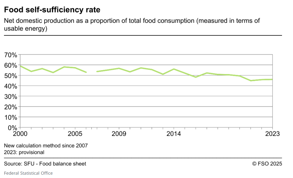 Например, на 2023 год Швейцария обеспечивала около 46% своего продовольственного потребления за счёт собственного внутреннего производства. Не тянут что-то 60 тысяч фермеров, вот же засада.