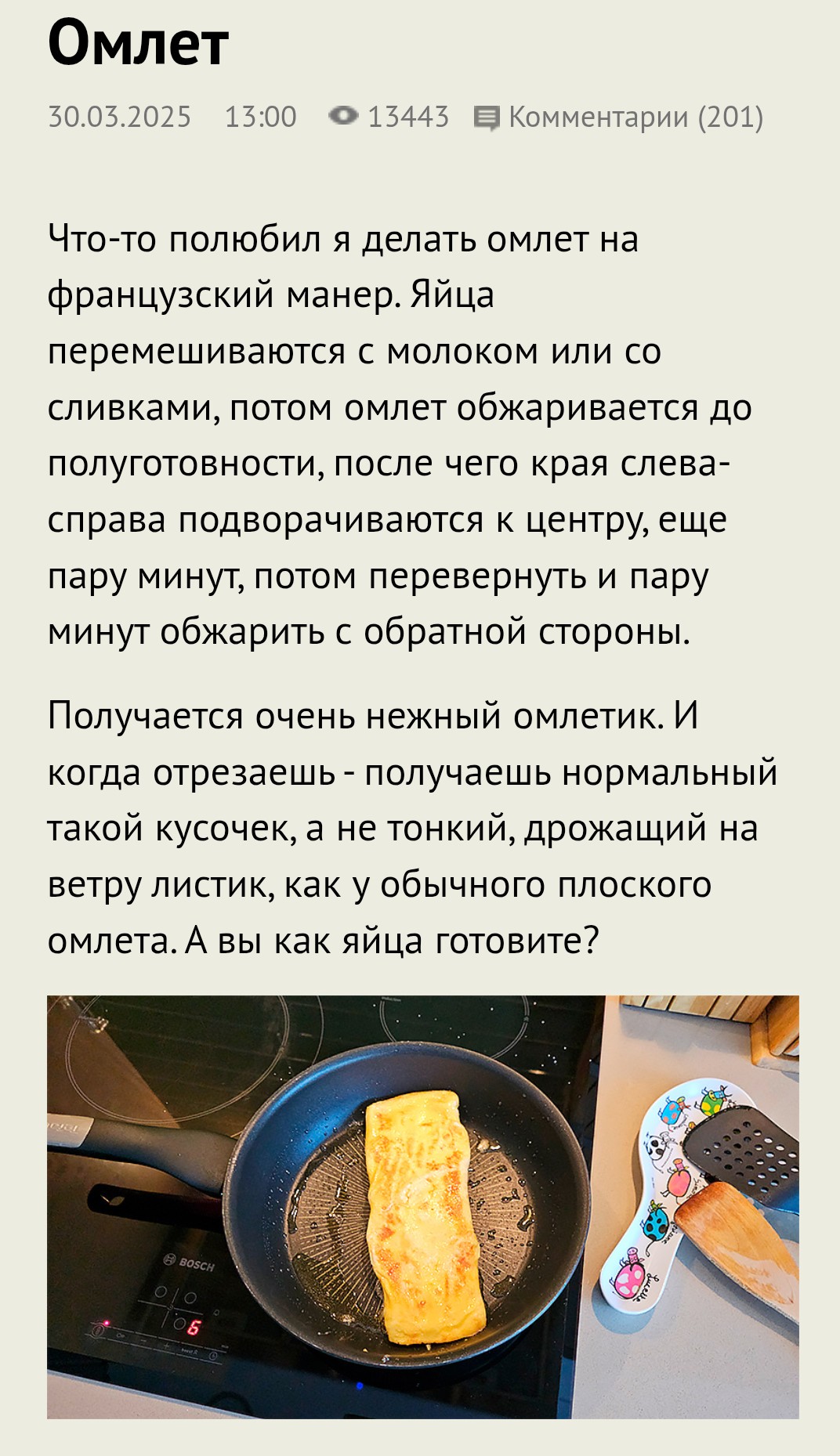 Как-то раз в Италии в гостинице на завтраке был специальный повар, который по просьбам постояльцев готовил различные варианты яичниц-омлетов. Я люблю яичницы-омлеты и попросил его приготовить омлет. Так он мне в результате выдал нечто восхитительно воздушное, очень нежное и невероятно вкусное, я раньше такое никогда не ел. И я был уверен, что у этого повара был какой-то шеф-поварский секрет, который позволял ему буквально за три минуты приготовить такое восхитительное блюдо. Может быть, думал я, у него масло сбивали вручную девственницы-весталки на заре. Или яйца для этого омлета несли какие-то особые курицы, которым ставят Бетховена и делают массаж.