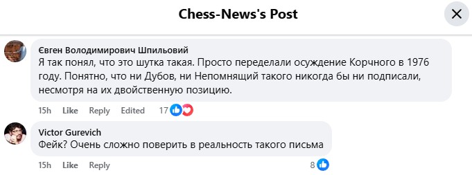 Еще коммент:Sergey FadeyevСлишком тонко))) Надо было хотя бы * поставить и пояснение дать. Не ожидал, что 95% не знает классику.______________________________________________________________Как по мне, важно то, что мало кто усомнился в реальности письма. А Карпов прилетел добавить от себя, отдельно.Solmir