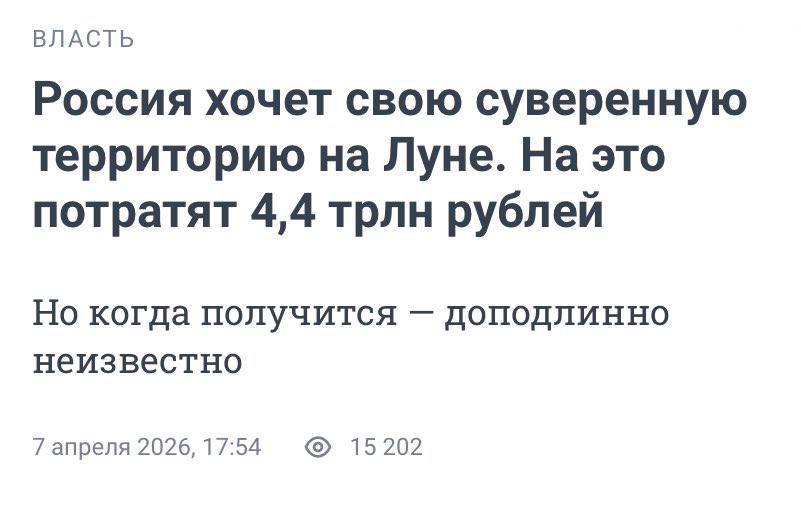 Пока американцы отправили космонавтов Artemis II облететь Луну, шарашка под названием "Роскосмос" рассказывает о том, как она лет через десять построит лунную базу, а лет через пятьдесят слетают на Марс.