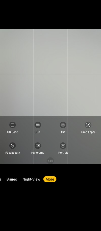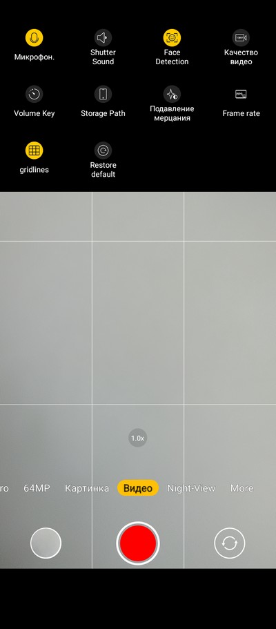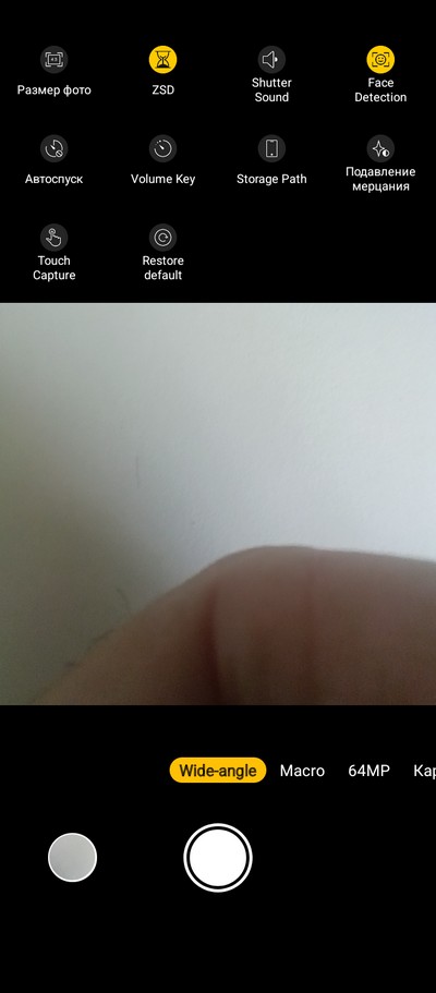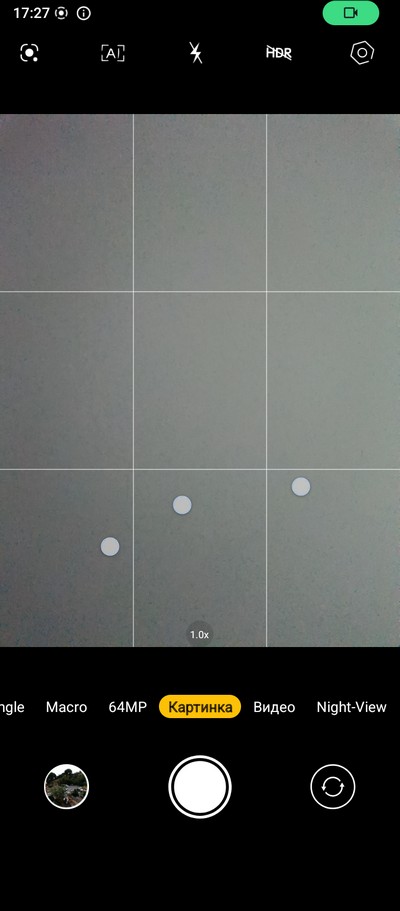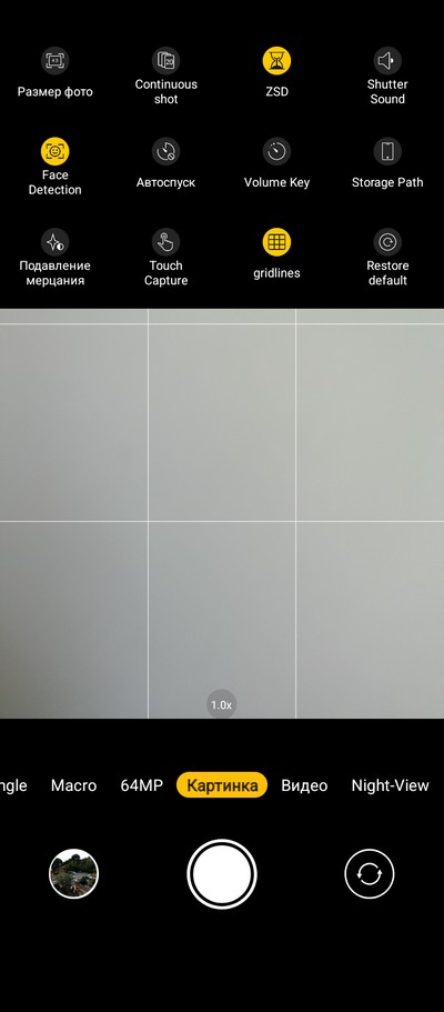Интерфейс камеры. Снизу переключаются режимы. Сверху - пиктограммы различных переключателей. На правом скриншоте - окно меню с настройками. Для сверхширика предусмотрен отдельный режим (почему-то), а в режиме фото (это называется "Картинка") можно переключаться только между основной камерой и 2-кратным цифровым зумом.