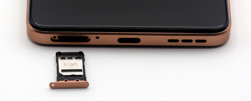 На нижней грани: слот под вставку с симкартками, микрофон, порт Type-C, прорези над стереодинамиком. Второй стереодинамик располагается на верхней грани.