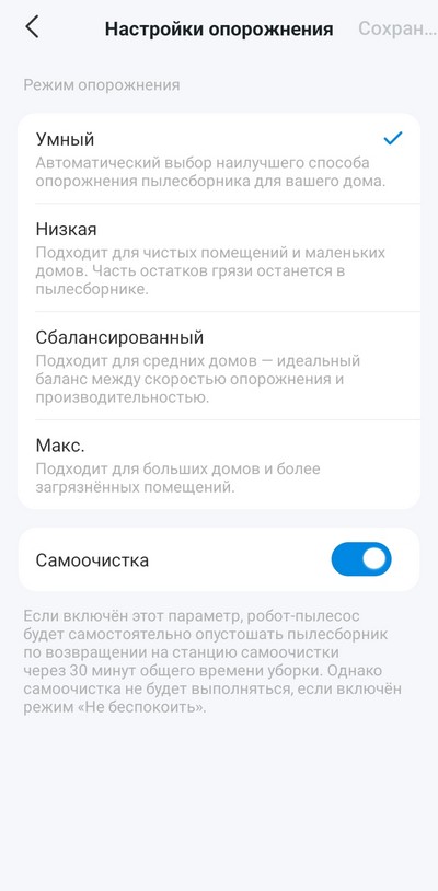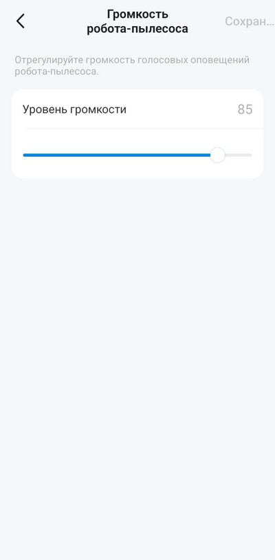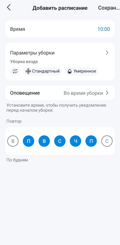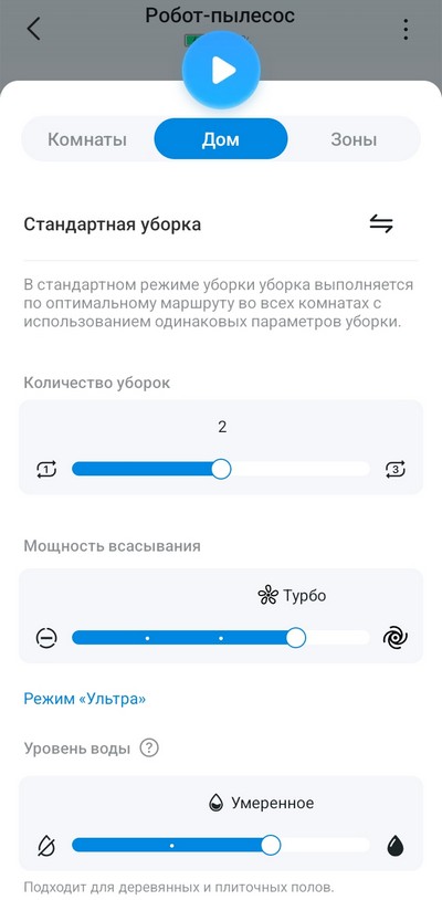 В приложении можно задавать порядок уборки помещений и параметры: количество уборок (например, два раза подряд - для большей чистоты), мощность уборки (чем больше мощность, тем больше шум), расход воды при влажной уборке.